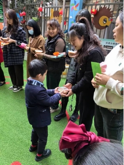 活動現(xiàn)場小朋友和家長一起載歌載舞,互動游戲,熱情洋溢。活動尾聲,小朋友代表還給到來的家長們紛紛送上福州特有的拗九粥,表達感恩。