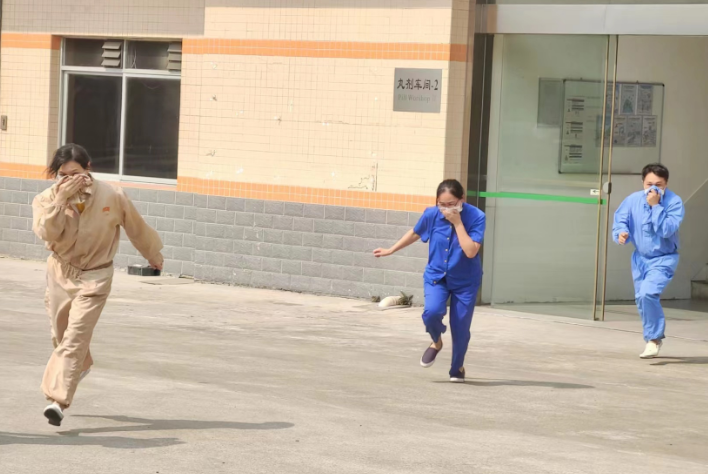 演練的第二部分模擬丸劑車間-2發生火災,車間主任王海瑤馬上啟動應急預案進行人員緊急疏散,車間的義務消防隊員連接消防水帶試圖控制火勢未果。安全保衛部接報后,迅速派出義務消防隊進行支援,隊員們背著精良的裝備,風馳電掣趕到現場分成兩隊開展救援工作。滅火隊伍迅速接起消防水帶對火源進行沖擊,和車間的義務消防隊員形成合力快速控制火勢。另一邊廂接報有員工被困火場,兩名消防隊員迅速穿上正壓呼吸套裝,以便突入火場進行搜救。在各位消防隊員的英勇奮戰下,火勢快速得到控制,車間人員也順利全部撤出,為整場演練交出了完美的答卷。