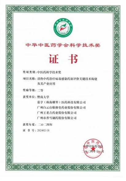 由廣州王老吉藥業股份有限公司攜手暨南大學等單位共同承擔的 “清熱中藥治療病毒感染藥效評價關鍵技術構建及其產業應用” 項目,榮膺中華中醫藥學會科學技術獎二等獎。 -
