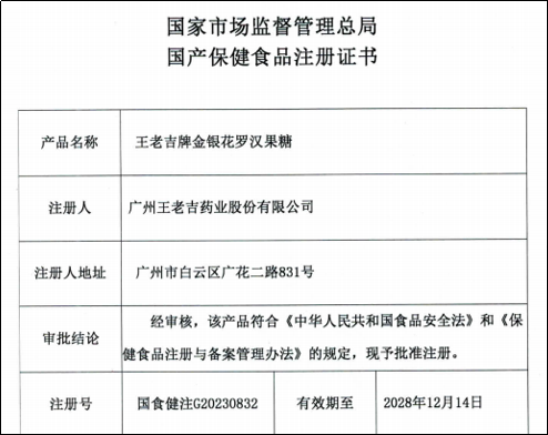 王老吉藥業(yè)獲得國家市場監(jiān)督管理總局頒發(fā)的“王老吉牌金銀花羅漢果糖”國產(chǎn)保健食品注冊證書,至此,王老吉藥業(yè)擁有了中成藥、保健食品、普通食品三類產(chǎn)品,業(yè)務板塊不斷擴大,本草潤喉糖果產(chǎn)品群不斷壯大。 -